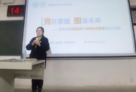 公共物理教学部主任胡永金首先以大学物理实验创新竞赛为例,从类型解读、备赛策略、队伍要求和获奖要素四方面分享了指导经验。随后,张琴围绕学生讲课类竞赛,系统介绍了团队选拔、项目选题及实战演练的全流程策略。在课程知识图谱建设交流中,学院教创赛一等奖获得者吴承瑞以《大学物理》数智课程为例,演示了如何将分散知识点整合为结构清晰、关联可视的知识网络,助力学生系统学习与教师精准教学。