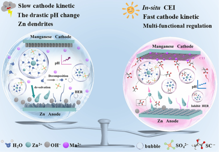 近日,国际材料领域顶级期刊《Advanced Functional Materials》(IF=19.0)在线报道了我院第一署名通讯单位题为“In-SituCEI Layer Fabricated by Multifunctional Carboxylate Additive Enabling the Reversible Jahn–Teller Distortion in Manganese Oxides”的研究论文。该研究针对水系锌锰电池在实际应用工况下,所面临因Jahn-Teller畸变导致锰溶出和结构不可逆转变,进而引发严重容量衰减的关键科学问题,首次提出了通过引入羧酸钠电解液添加剂(乳酸钠),在正极表面原位构筑阴极电解质界面层(CEI)的设计思路,协同解决了上述科学难题。