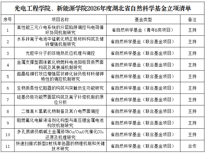 近日,湖北省科学技术厅发布了《省科技厅关于2026年度湖北省自然科学基金拟立项项目公示》,光电工程学院在此次申报中表现突出,拟共计获批青年B类项目1项、联合基金项目10项,立项资助总经费达102万元,实现了2026年科研工作的“开门红”。