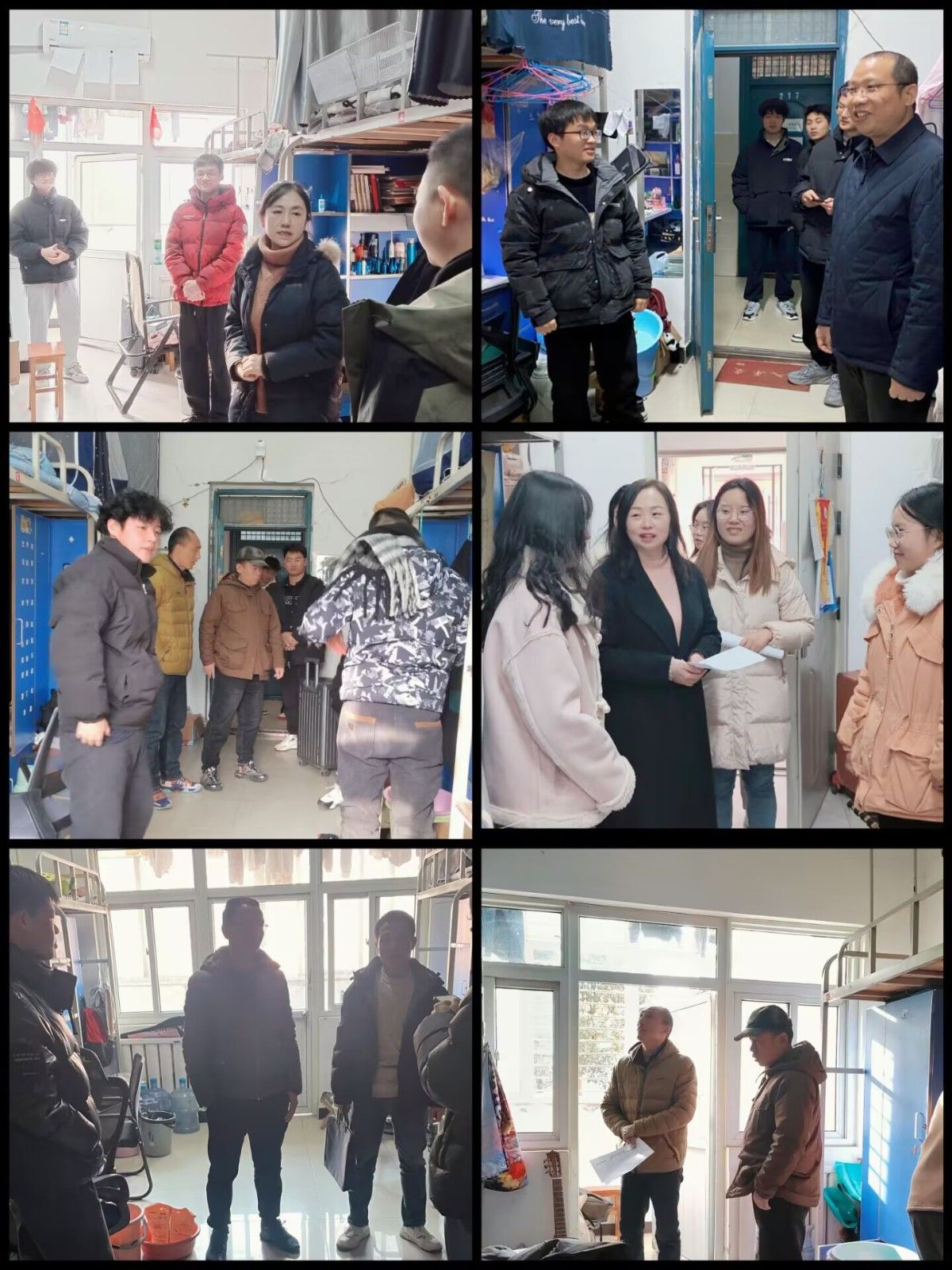老师们分批走进学生宿舍,为学生送去新春祝福,详细询问了学生返校后的生活和学习情况,及时了解学生的思想动态,并重点检查了宿舍安全隐患情况,确保学生的生活环境安全无患,走访中领导与老师们再三叮嘱学生一定要注意宿舍用电安全、提高防范电信诈骗安全意识,做好补考复习、诚信应考,希望同学们保持宿舍的卫生整洁,严格落实宿舍用电安全、消防安全,做好宿舍安全防范工作,共同营造良好的宿舍文化和学习氛围。