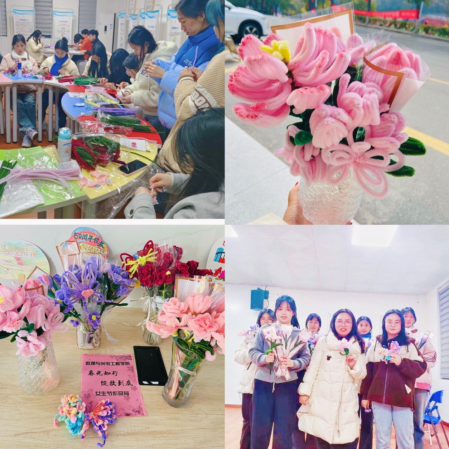 3月6日晚上,校心理中心多功能团体辅导室传来了欢声笑语,这是数理与光电工程学院为庆祝“女生节”开展的以“春光如许,绽放到底”为主题的扭扭棒创意活动,学院分团委书记李萌、辅导员郭煜以及全院60余名女同学一起参加了活动。