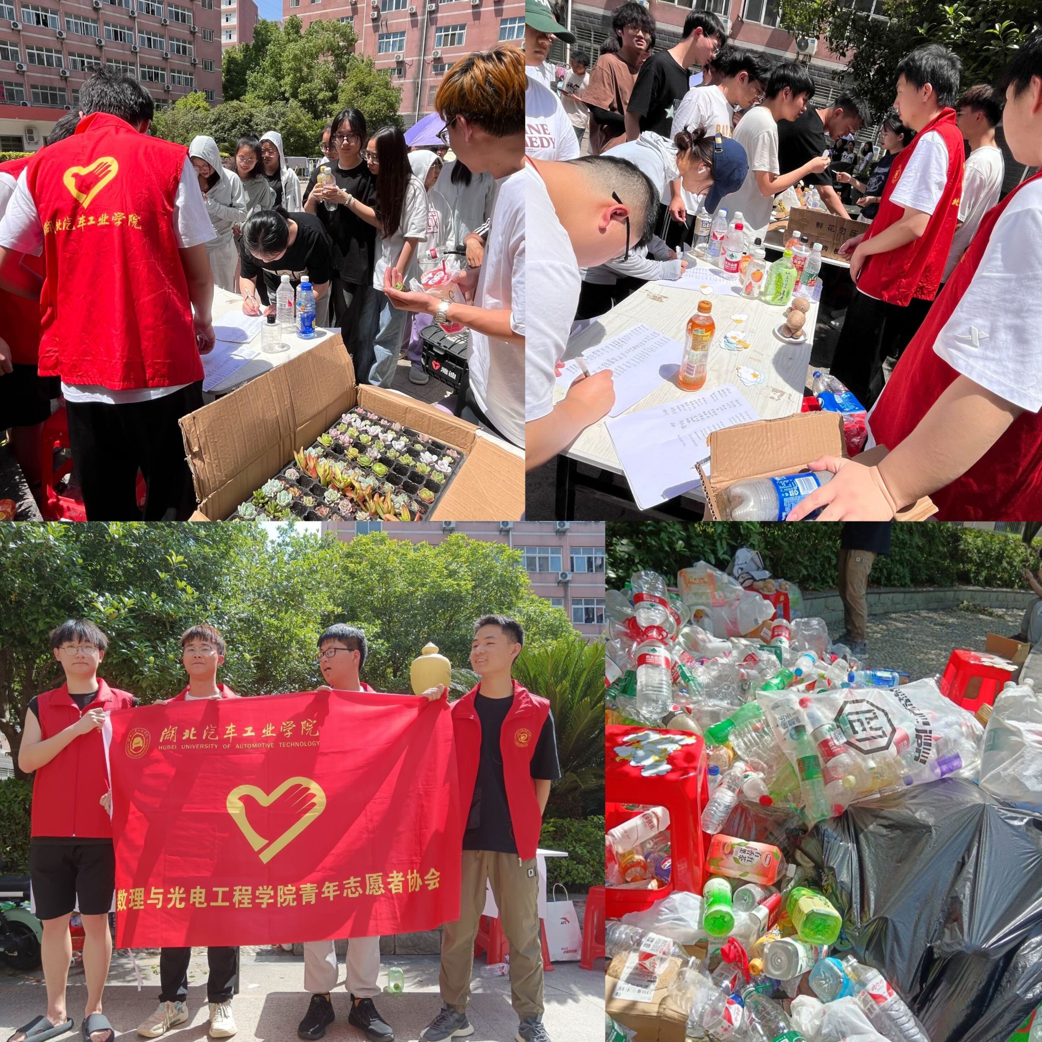 5月13日下午,湖北汽车工业学院数理与光电工程学院青年志愿者协会星空志愿服务队在桃园文化广场成功举办了“塑瓶换繁花,共植此星空”环保志愿服务活动。此次活动旨在通过回收废旧塑料瓶,换取绿植花卉的方式,鼓励师生积极参与环保行动,共同营造绿色、和谐的校园环境。