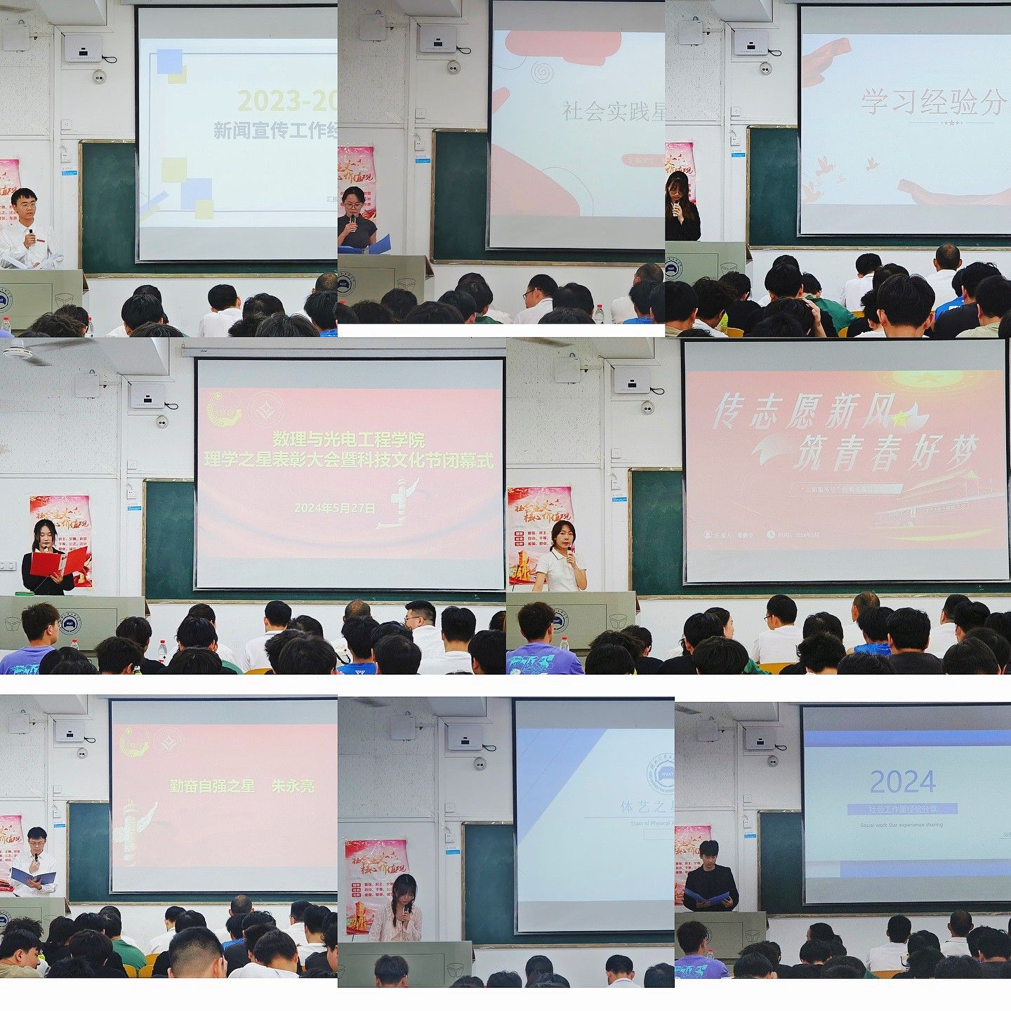 本网讯,为表彰过去一年在学习科研、志愿服务、文艺体育、社会实践等方面取得突出成绩的学生,进一步激发全院学生参加课外活动的热情,5月27日下午,数理与光电工程学院在2104教室隆重举行了“理学之星”表彰大会暨科技文化节闭幕式。数理与光电工程学院分党委副书记张朋刚、学工办主任卢旭、分团委副书记李萌、辅导员秦运来、郭煜及22级、23级部分学生参加大会。