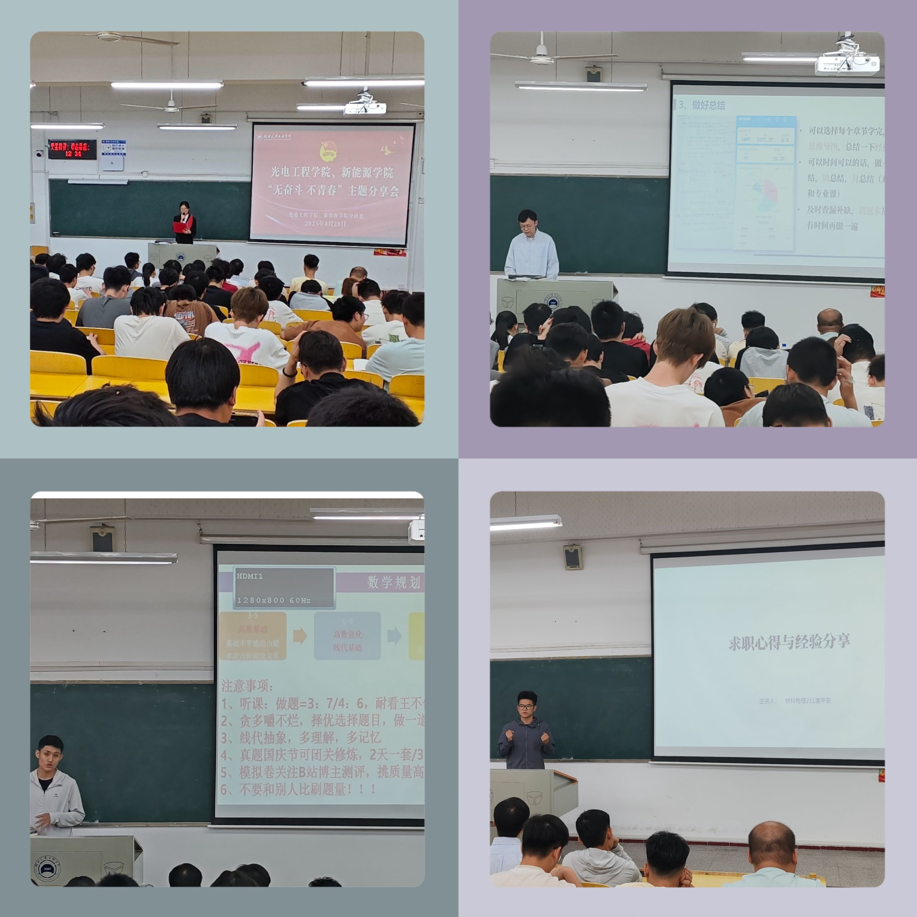 为激发青年学子奋斗热情,引导其明确成长方向,践行青春使命。4月28日,光电工程学院、新能源学院在2101教室举行了“无奋斗,不青春”主题故事分享会。本次活动邀请了校友王泽琛、优秀毕业生李鹏杰、朱永亮、就业先锋潘平安四位嘉宾,围绕大学生活规划、考研、就业等主题展开分享,吸引了一百余名在校生及青马学员参与活动。