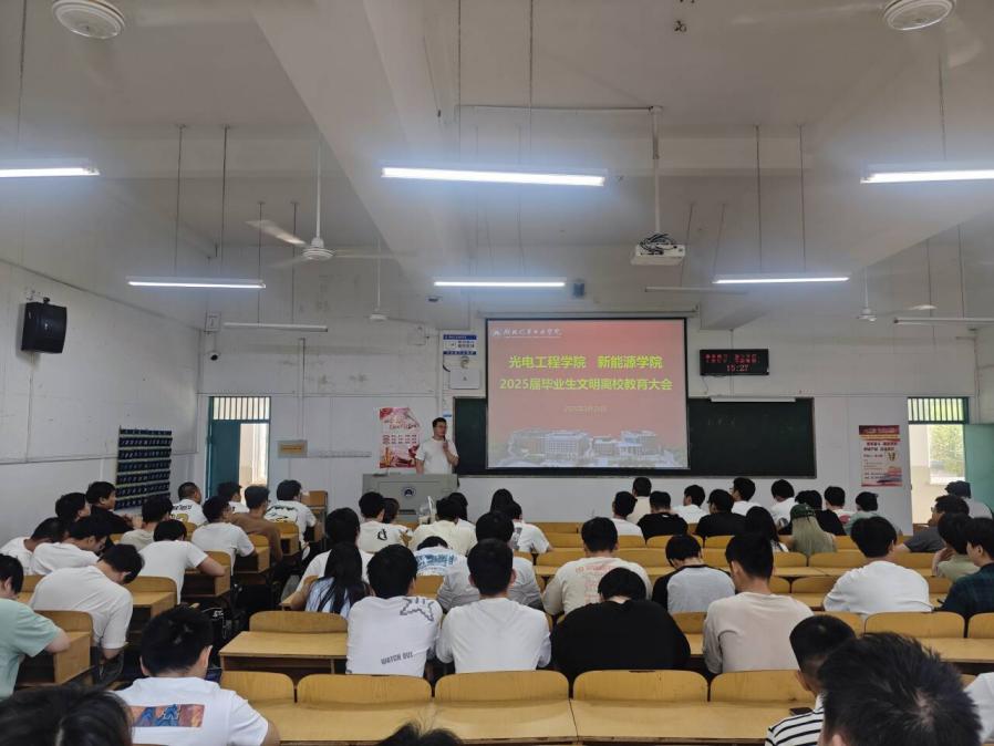 为确保2025届毕业生文明安全离校,营造安全、和谐的离校氛围,扎实推进毕业生离校前的教育、管理和服务工作,增强毕业生爱校荣校情怀和感恩意识。5月25日,在2104教室,光电工程学院、新能源学院召开了2025届毕业生安全文明离校教育大会。党委副书记张朋刚、辅导员和全体毕业生参加会议,学工办主任卢旭主持会议。