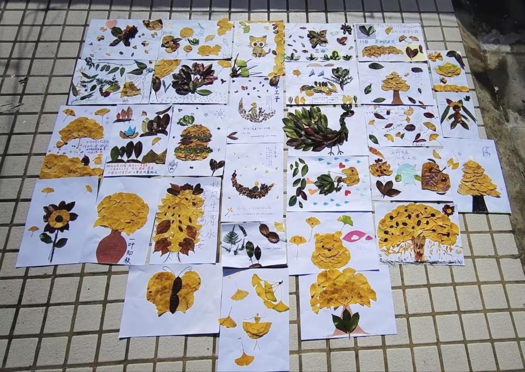 落叶艺术创作环节成为活动的亮点。在“落叶成画”活动中,志愿者现场进行指导,同学们充分发挥创意,将落叶转化为画作、立体雕塑、拼贴画等各类艺术品。在“捡秋叶,做书签”活动中,同学们精心挑选喜爱的秋叶,借助彩带、胶水等工具制作书签,并在书签上写下自己的感悟或祝福语,在动手实践中感受自然之美与创作的乐趣。在“植物拓染”活动中,同学们在工作人员的指导下,利用拓染纸、锤子、颜料等工具,将校园树叶的纹理与色彩定格于作品中,每一件拓染作品都成为独一无二的自然艺术记录。