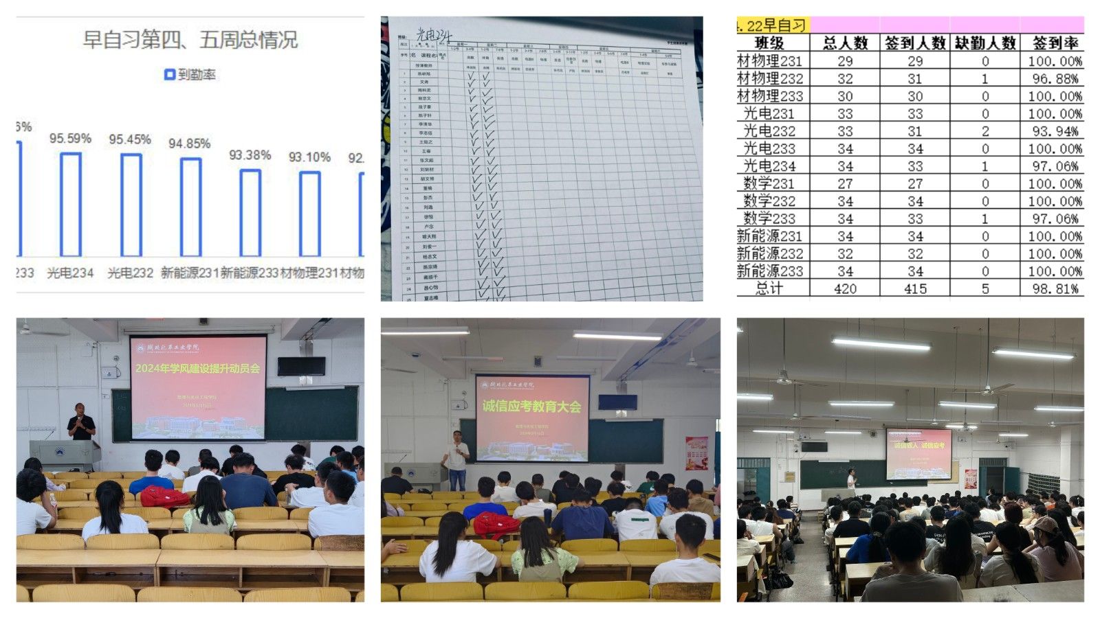 学院通过召开学风建设主题班会、班委例会、学生干部例会,学习委员考勤上报,辅导员、班主任进课堂,学院通报等形式,形成学风建设督查机制,以此强化学生守纪意识。通过班会宣讲、班委带头宣誓和诚信应考承诺签署等违纪警示教育和诚信教育,严肃考风考纪,深化学生的诚信意识,形成风清气正的良好学习氛围。