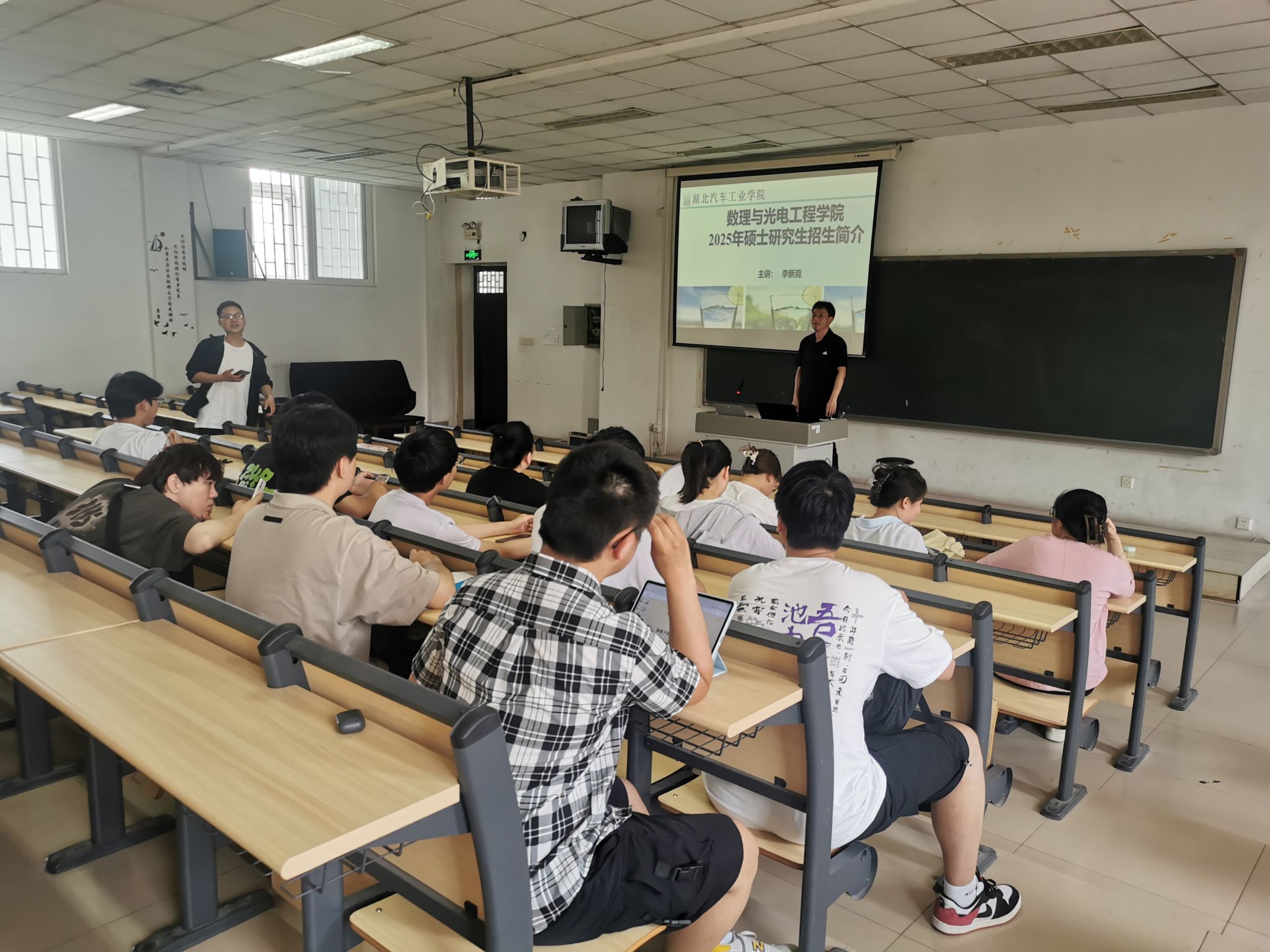 在研究生招生宣传会上,李新克详细介绍了湖北汽车工业学院的发展概况,对数理与光电工程学院师资结构、科研平台、科研成果、硕士点概况、研究生教育教学及就业去向等情况为学生进行了详细介绍。随后就相关专业的考试科目、招生人数为学生进行了解答,并从如何择校、如何备考、如何应考等方面为同学们分享经验。