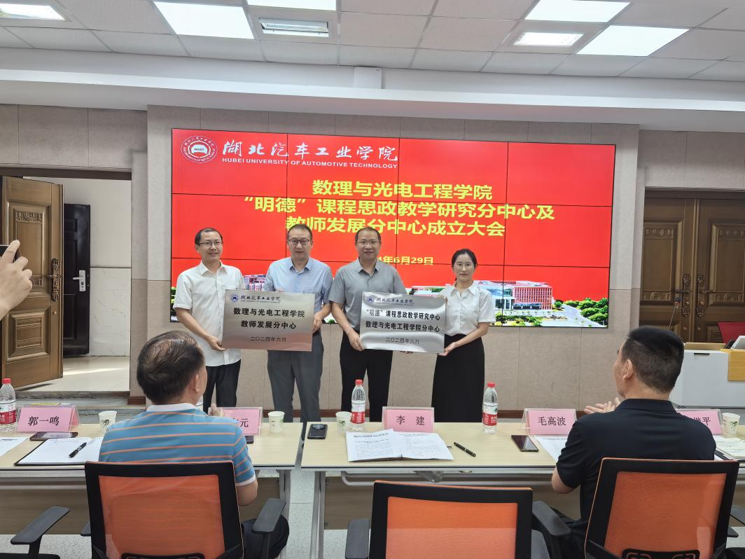 胡政发宣读了《关于数理与光电工程学院“明德”课程思政教学研究示范分中心建设的通知》以及《关于成立数理与光电工程学院教师发展分中心的通知》。成继平、郭一鸣分别代表学校“明德”课程思政教学研究中心和教师发展中心为两个分中心授牌。数理与光电工程学院院长李建、副院长胡政发分别向分中心特聘研究员、特聘顾问颁发聘书。学院“明德”课程思政教学研究示范分中心秘书胡永金,教师发展分中心秘书周骁分别介绍了两个分中心的工作思路。