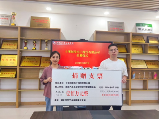 张默代表学校对十堰创美电子科技有限公司的捐赠表示衷心感谢,该公司所展现的社会责任感,不仅为学院的发展注入了动力,也为我们树立了积极的榜样,希望十堰创美电子科技有限公司持续关注和支持学校和学院事业发展。