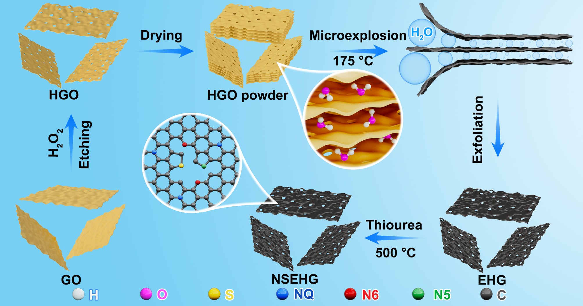 近日,国际材料领域顶尖期刊《Advanced Materials》 (IF=27.4)在线发表了我校储能与动力电池湖北省重点实验室题为“Ultrahigh Pyridinic/Pyrrolic N Enables N/S Co-Doped Holey Graphene with Accelerated Kinetics for Alkali-Ion Batteries”的研究论文。该研究首次发现并揭示了氧化石墨烯低温微爆炸热剥离的现象和机理。所制备的超高含量吡啶氮、吡咯氮加速了氮/硫共掺杂多孔石墨烯的储钾反应动力学,作为钾离子电池负极材料具有优异的倍率和循环性能,优于已报道的石墨烯材料。