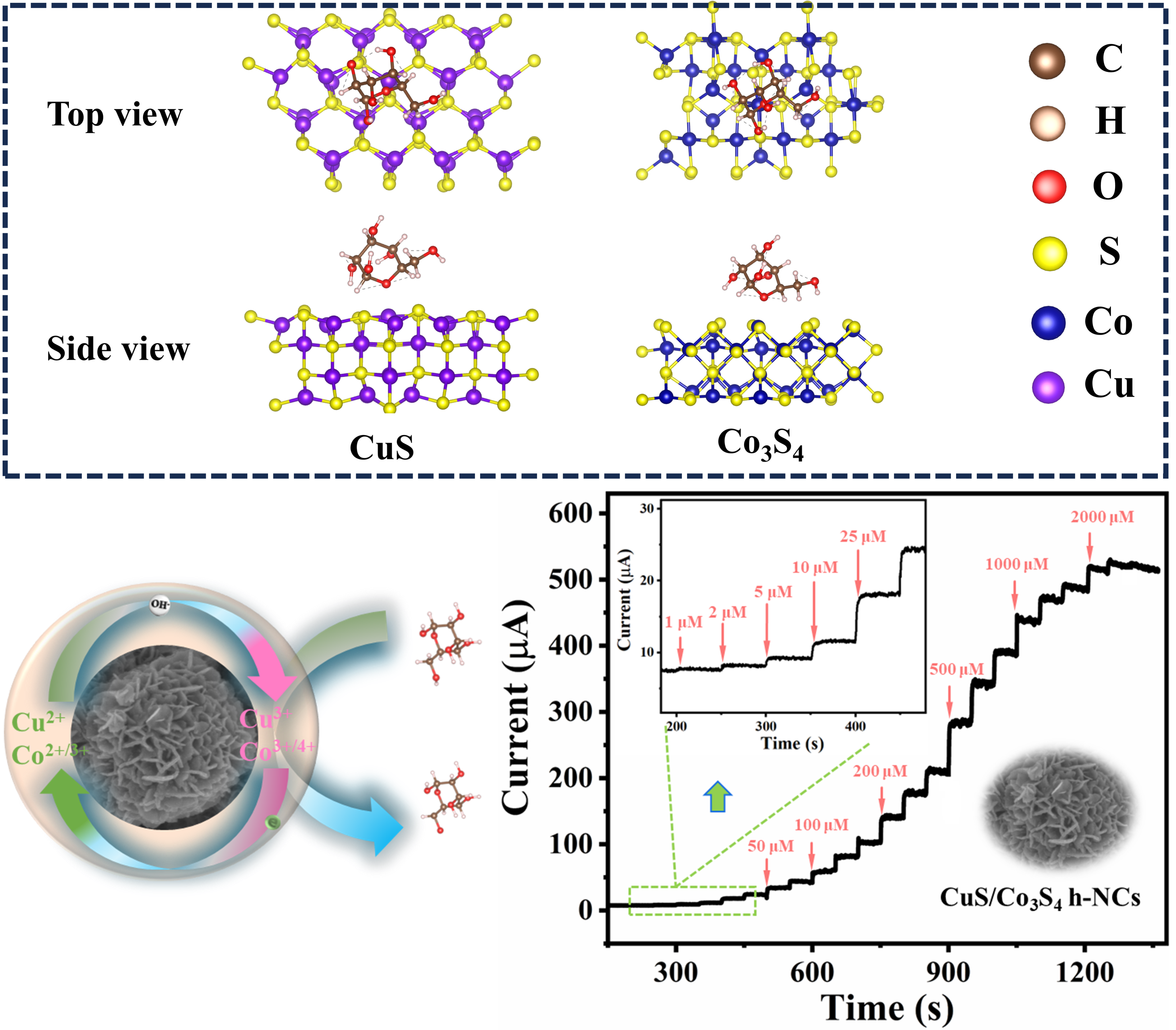 全球糖尿病发病率正逐年攀升,已成为严重危害人类生命健康的公共问题。发展便捷、高精度的葡萄糖电化学传感器刻不容缓。其中,电极材料的成分选择和结构设计是实现高灵敏电化学传感的关键。本研究利用CEP和模板离子再利用法,整合CuS和Co3S4作为杂化纳米笼(h-NCs)。理论计算和实验共同揭示,CuS/Co3S4h-NCs在电催化活性、葡萄糖吸附和电导率等方面具有理想特性,对葡萄糖表现出高灵敏的传感效应,灵敏度达2731.8 μA mM-1cm2,血糖回收率高至92.4%。