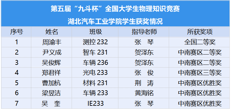 近日,第五届“九斗杯”全国大学生物理知识竞赛获奖名单揭晓。汽院学子首次参赛,在数理与光电工程学院大学物理教学团队的精心指导下,经过初赛、复赛和决赛三轮激烈角逐,取得了优异成绩,共计获得全国二等奖1名、中南赛区二等奖2名、三等奖1名、优胜奖3名。