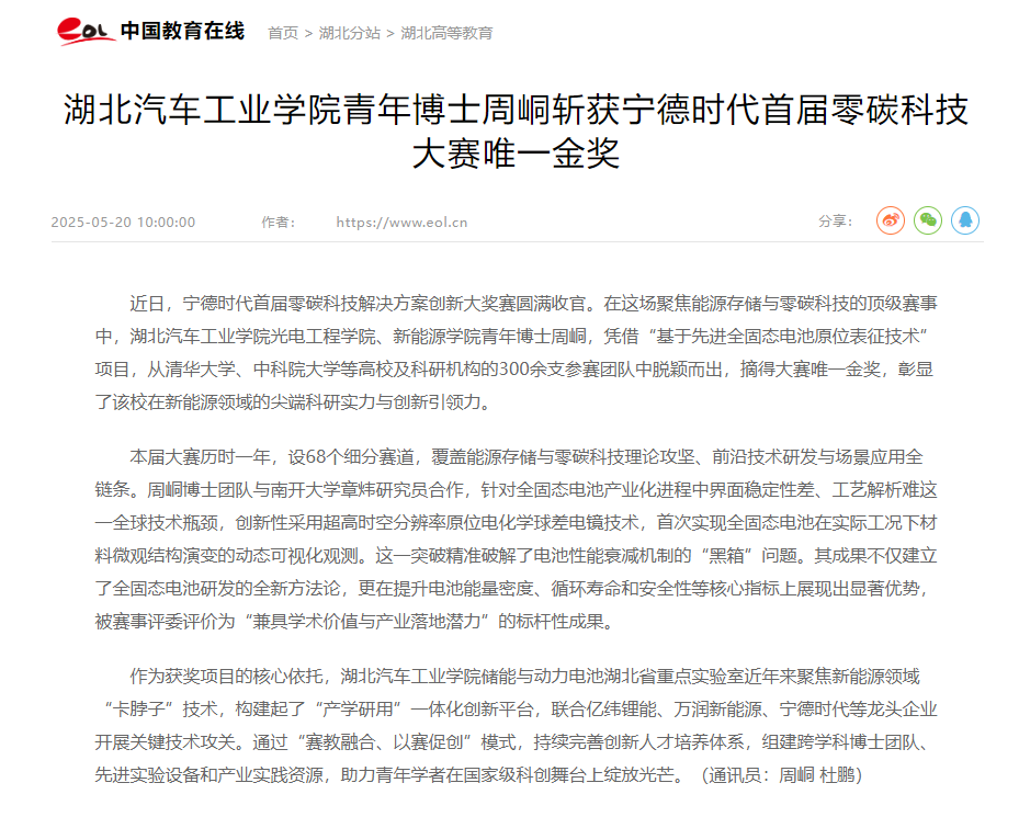 上一条:【湖北日报】湖北汽车工业学院光电工程学院、新能源学院青年博士周峒斩获宁德时代首届零碳科技大赛唯一金奖