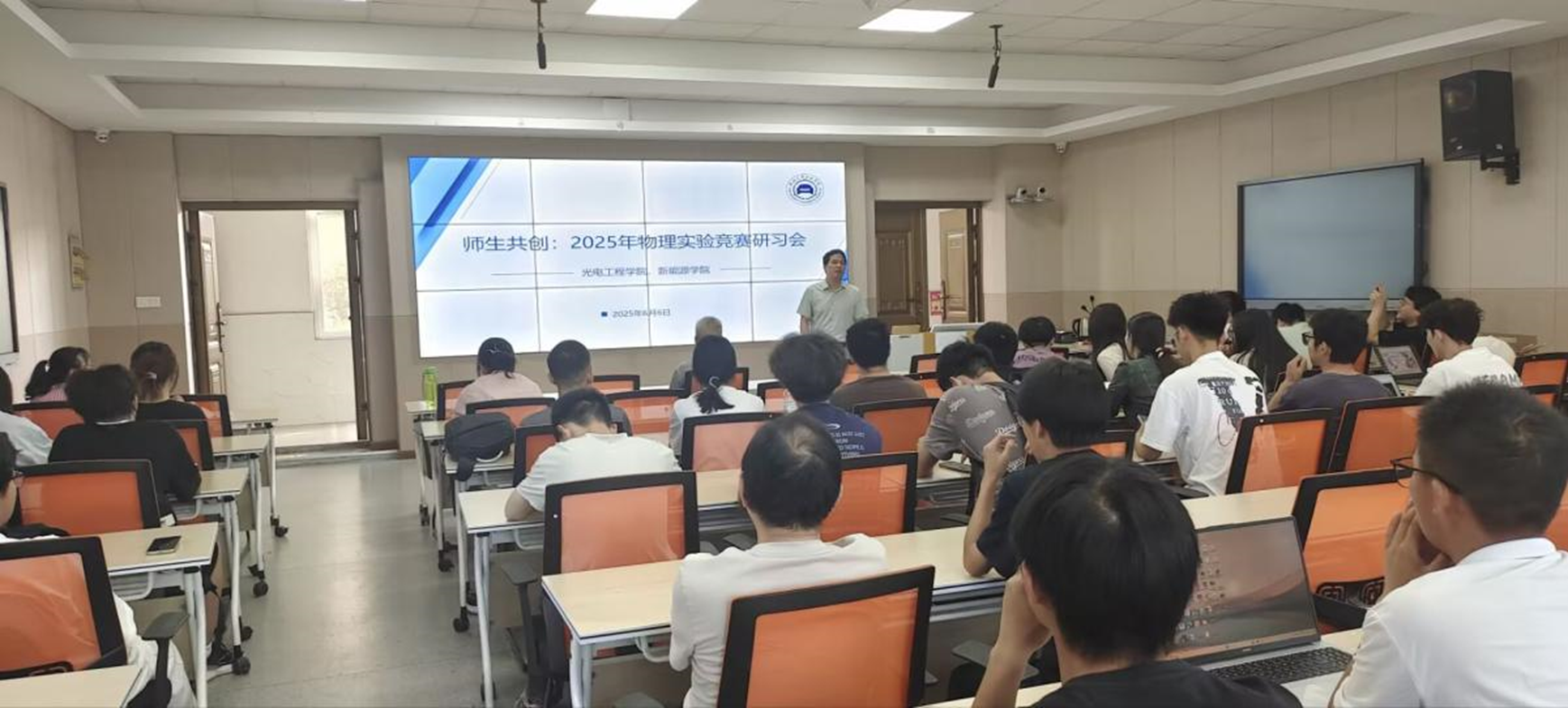 为助力学生备战第十一届湖北省大学生物理实验创新设计竞赛工作,提升全体师生的实践与创新能力,6月6日上午,光电工程学院、新能源学院举办的“师生共创:2025年物理实验竞赛研习会”在1305教室圆满落幕。此次研习会旨在激发大学生对物理实验的兴趣,提升其动手创新能力,加强师生间的互动与交流。会议由公共物理教学部主任胡永金老师主持,全体竞赛指导老师和参赛学生参加了本次研习会。