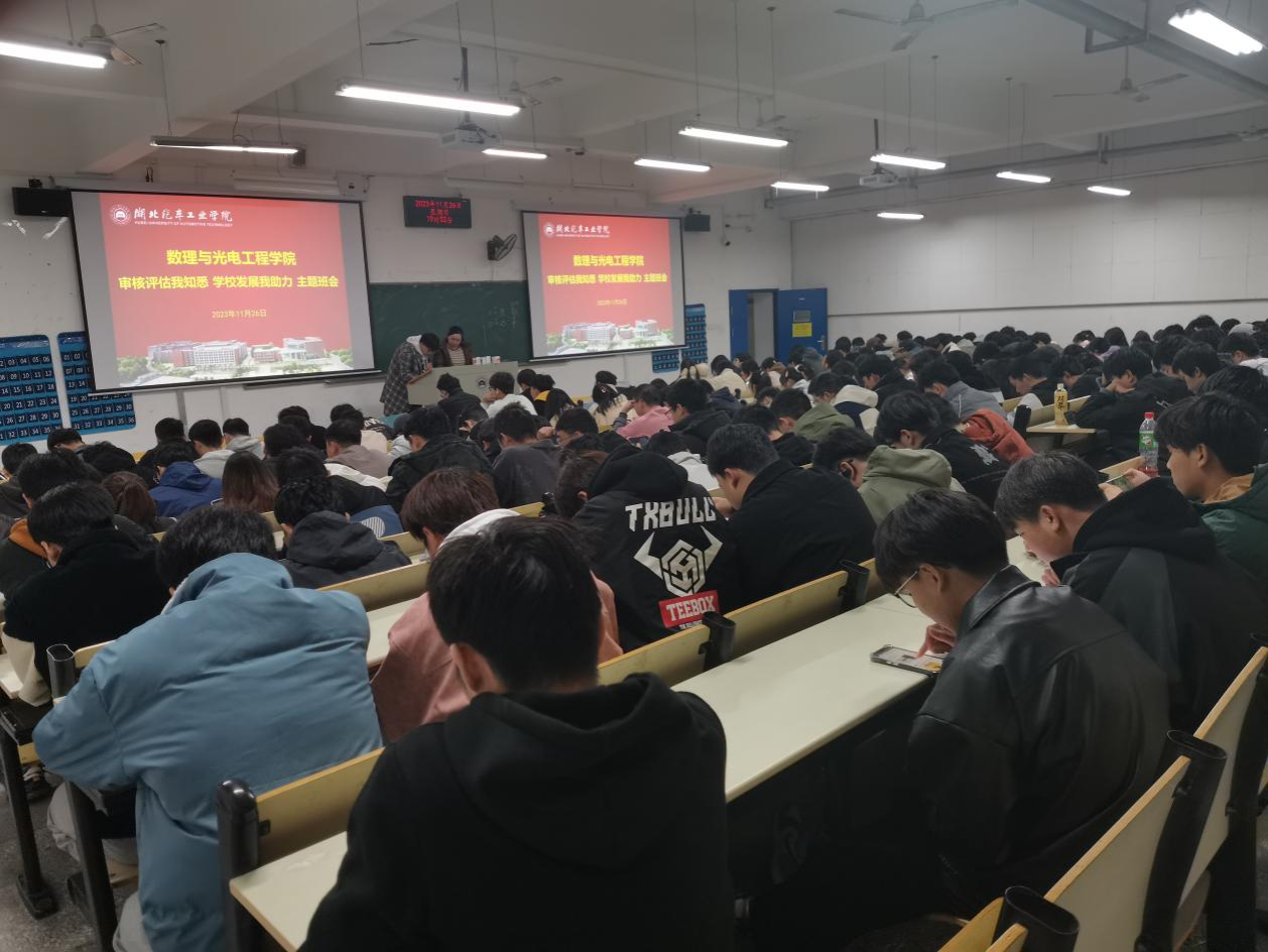 为教育引导学生熟知熟会新一轮审核评估工作内容,进一步了解学校发展历史和办学特色,11月26日晚,数理与光电工程学院在第六教学楼分专业、分年级开展“审核评估我知悉,学校发展我助力”教育活动。学院2021级、2022级、2023级全体学生参加教育活动,辅导员卢旭、李萌、秦运来、郭煜分别做了宣传教育。