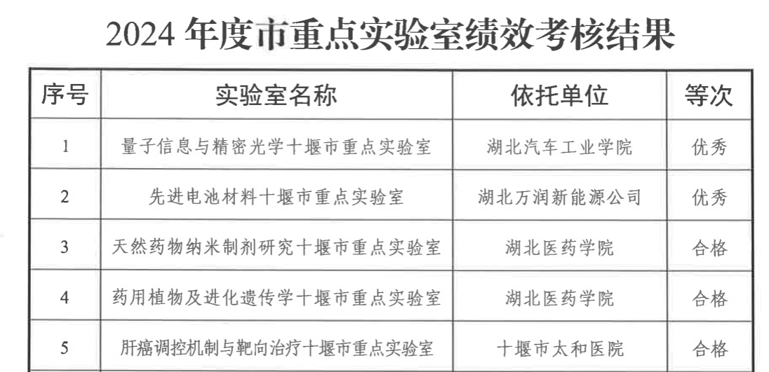 近日,十堰市科学技术局正式公布了市重点实验室2024年度绩效评估结果。依托光电工程学院建设的“量子信息与精密光学十堰市重点实验室”在本次考核中表现卓越,排名第一并获优秀等次评价。这一佳绩标志着我校在相关领域的科技创新能力、平台建设水平与人才培养质量获得了上级主管部门的高度认可。