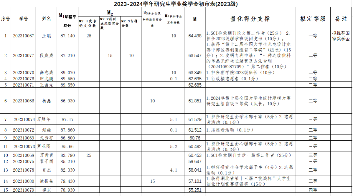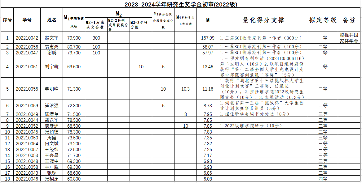 根据《省教育厅 省财政厅关于印发研究生奖助学金管理办法的通知》(鄂教财〔2014〕8号),湖北省教育厅2024年研究生奖助学金评审工作的相关要求、《湖北汽车工业学院研究生奖助学金管理办法(试行)》的有关规定以及《关于开展2023—2024学年研究生学业及国家奖学金评审工作的通知(汽院研工通〔2024〕5号)》,结合《数理与光电工程学院2023—2024学年研究生奖学金评定量化计算办法》。经研究生们个人申请,学院审核评选,现将2023-2024学年研究生学业奖学金学院初评结果进行全院公示,公示期为5个工作日,2024年10月11日至10月16日,在此期间若有异议,请于2024年10月16日前将意见反映至1118办公室王晴岚老师处。