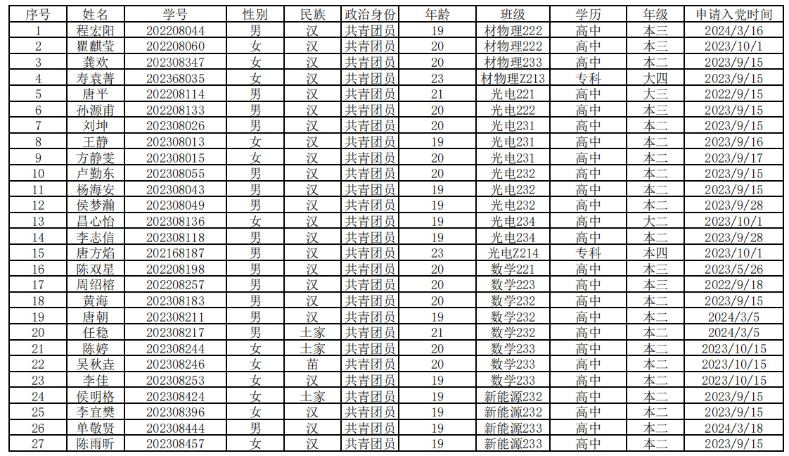 根据《中国共产党章程》《中国共产党发展党员工作细则》及我校党员发展工作的相关规定,经党员推荐、群团组织推优,数理与光电工程学院学生第一党支部、学生第二党支部研究,数理与光电工程学院分党委审议,拟确定材物理222程宏阳等27名同志为我院入党积极分子,现予以公示,接受广大党员、群众监督。