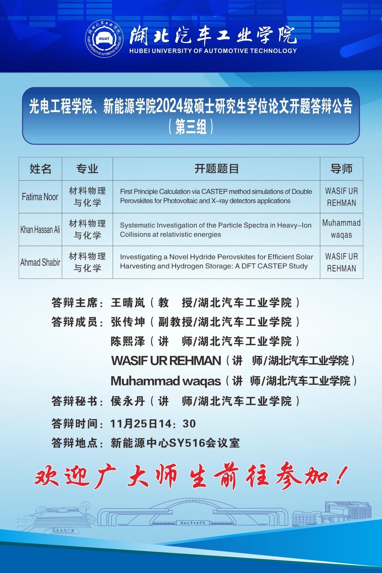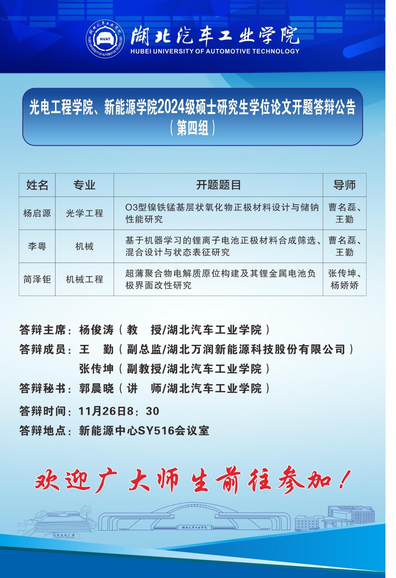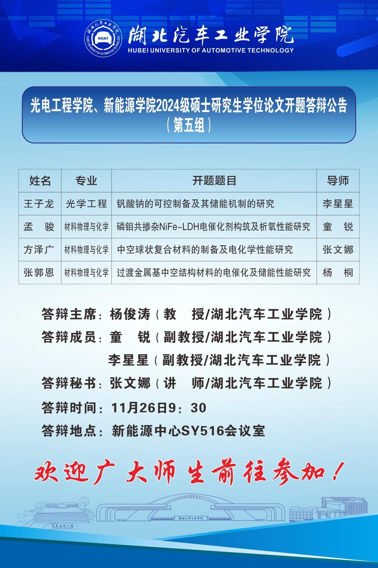 根据国务院学位委员会、教育部《关于进一步严格规范学位与研究生教育质量管理的若干意见》(学位[2020]19号)的要求,以及学校《关于做好2024级硕士研究生学位论文开题工作的通知》要求,结合《湖北汽车工业学院研究生学位论文开题报告管理办法》,现将光电工程学院2024级硕士研究生学位论文开题答辩工作安排第三、四、五组公告如下: