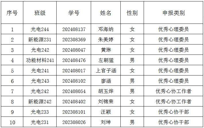 为充分发挥大学生心理工作者在朋辈辅导、同伴教育中的重要作用,持续优化班级、宿舍心理健康环境,强化心理委员的责任担当与服务意识,学院特组织开展2024-2025学年本科生优秀朋辈心理骨干评选,评选结果公示如下: