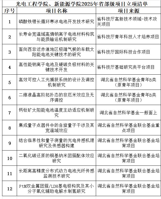 近日,湖北省科学技术厅公布了《省科技厅关于下达2025年度第一批省级科技计划项目的通知》,光电工程学院、新能源学院在此次申报中成绩突出,获批青年科技人才培养项目1项,国际科技合作项目1项,基础研究类平台项目1项,另与企业联合申报获批高新技术领域-技术攻关项目1项,立项资助经费达151万元。2025年以来,学院共获批省自然科学基金、省级科技计划项目各类省部级项目共计12项,立项资助经费达241万元。